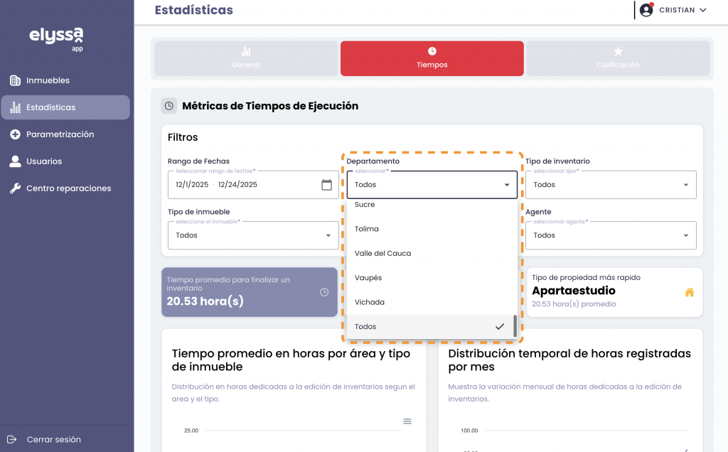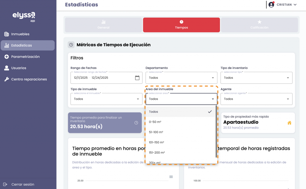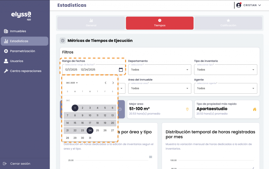 Dentro de esta sesión encontrarás la zona “Métricas de Tiempos de Ejecución”, la cual cuenta con una sección de filtros que permite personalizar la información según las necesidades de consulta.