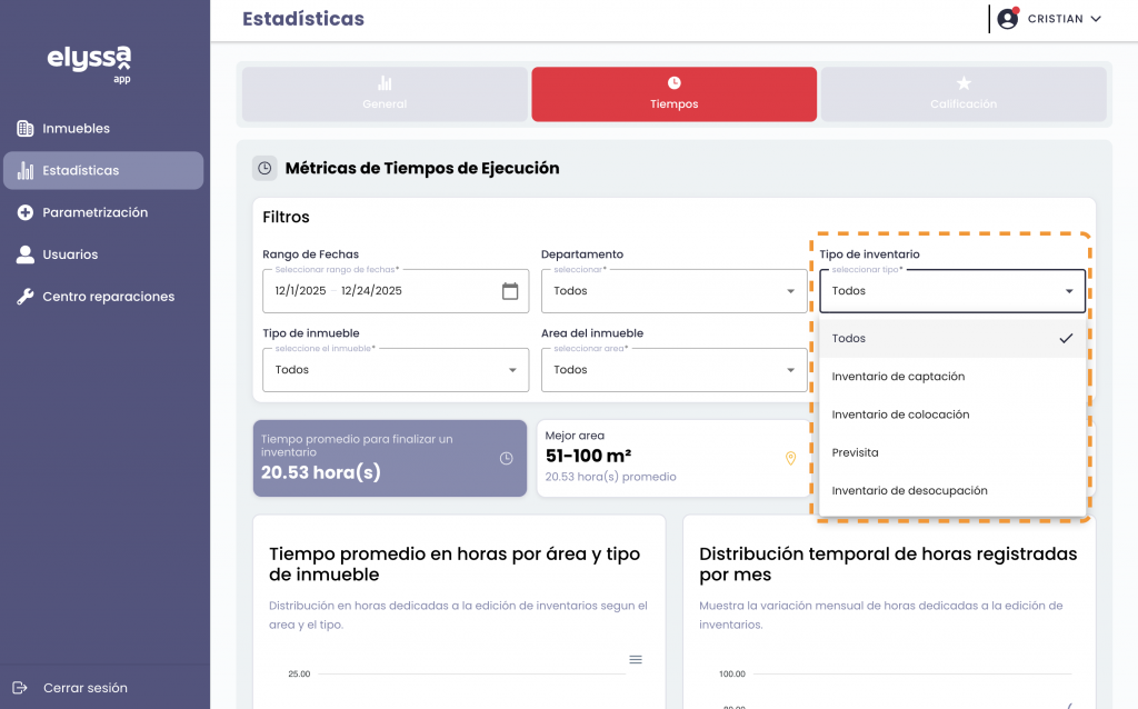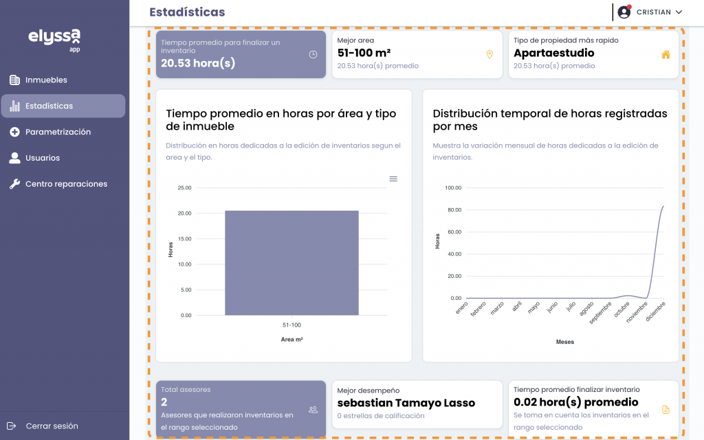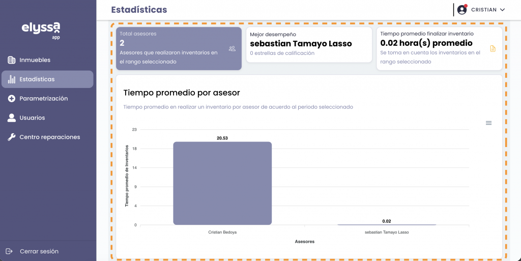 Calculado a partir de los inventarios realizados dentro del rango de fechas seleccionado. - Tiempo promedio por asesor, el cual permite comparar de forma visual los tiempos de ejecución entre los distintos asesores.