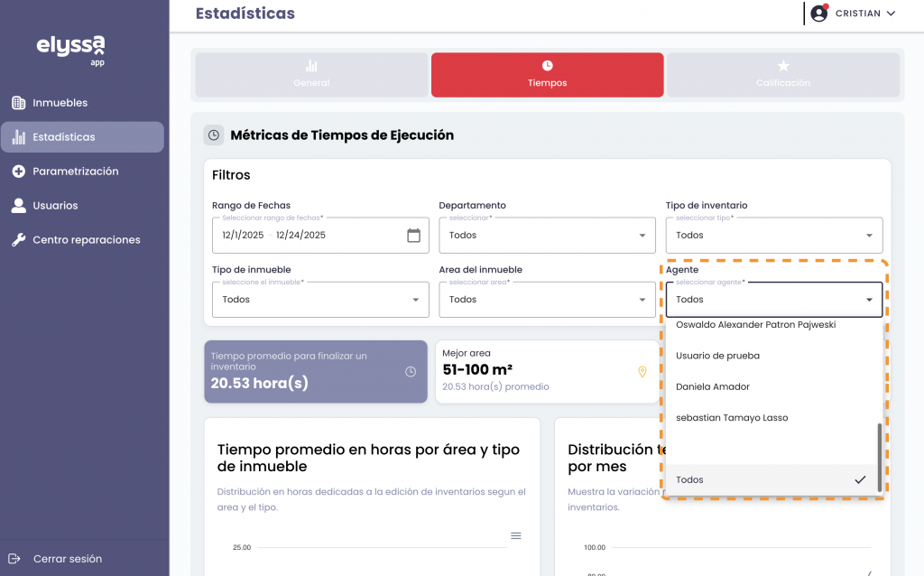 Permite seleccionar un agente inmobiliario, lo cual facilita el seguimiento y análisis detallado de los tiempos de ejecución asociados a su gestión.