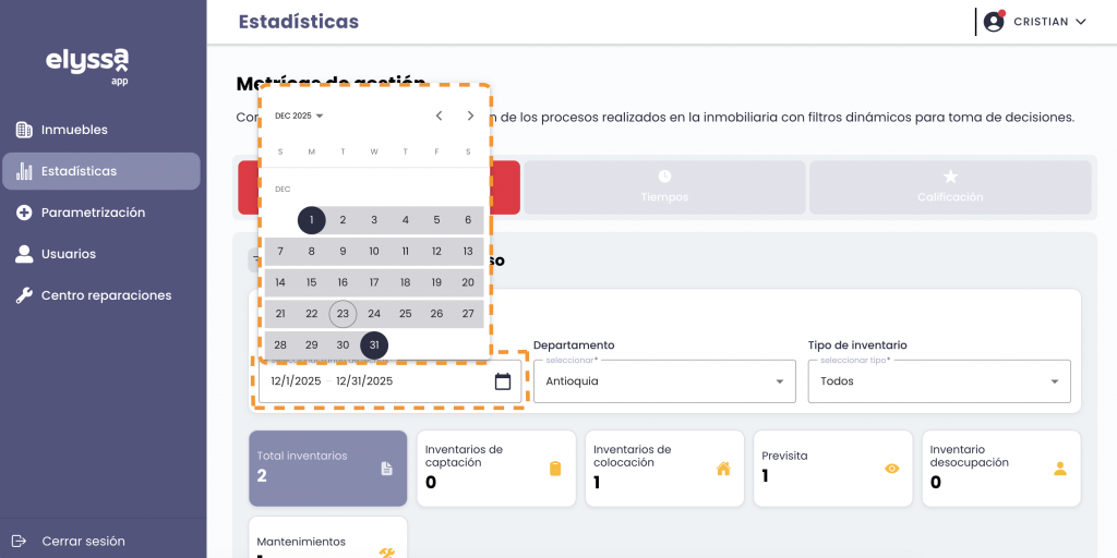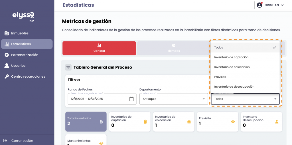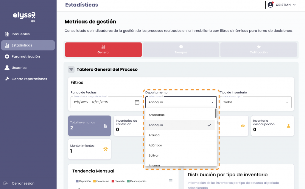 Opción desplegable que permite filtrar las métricas según el departamento que se desee analizar.
